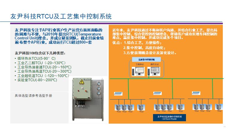 上海友尹化工科技-专业从事TCU温控设备研发、制造,邀您参加CMC博览会发表时间:2019-08-16 15:32 识别二维码,获取免费参会资格 上海友尹化工科技有限公司 2019中国生物&化学药物技术服务博览会 展位号:A1a 上海友尹化工科技有限公司是国内第一家从事TCU温控设备研发、制造的技术型科技企业,TCU温控系统是实现制药自动化生产的必备设备,友尹公司以TCU为拳头产品,全力投入研发资源,集合制药生产的各种控制要素,并结合行业的DCS,SIS系统,来实现制药行业的自动化控制;更好地解决当前制药行业用工荒,安全事故频发,环保要求不达标的行业难题。 TCU化学反应自动控制系统代表了制药工业的发展方式,可以提高药品的生产质量,国内外客户更容易对这种生产方式满意,更容易赢得客户信赖,企业生产方式更符合GMP和FDA认证的要求,为药品走出国门提供技术保障。 我们的客户遍布制药行业一流的企业,经过多年的实践检验,成熟可靠;我们愿意用专业的技术,优质的服务,来赢得客户信赖,与客户一起成长!