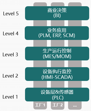 从底层PLC设备到信息化,究竟有多远?发表时间:2022-03-04 14:57 工业化控制层概述 工业化控制层包括智能产品/智能生产设备/智能测试设备、数据采集、设备维修、设备维护保养、预测性维护、机器人自动巡检点检、远程监测与控制等。 智能产品/智能生产设备/智能测试设备:集先进制造技术、信息技术和智能技术为一体,具有感知、分析、决策功能的监测、控制与驱动设备及产品。 ◉ 数据采集:指通过在线的传感器或软件技术对被测对象进行自动采集数字或模拟信号,并传送到DCS、PLC、DNC、SCADA、仪表等系统进行分析、处理。全部的数据采集系统包含了传感器、信号调理、模\数转换、通讯接口,以及信号处理设备、信号处理软件等。 ◉ 设备维修:指为保持、恢复以及提升设备技术状态进行的技术活动。其中包括保持设备良好技术状态的维护、设备劣化或发生故障后恢复其功能而进行的修理,以及提升设备技术状态进行的计划性或紧急性的技术活动。 ◉ 设备维护保养:是设备维修与保养的结合。为防止设备性能劣化或降低设备失效的概率,按事先规定的计划或相应技术条件的规定进行的技术管理措施。包括事后维护、预防维护、生产维护、预测维护等。 ◉ 设备预测性维护:基于生产过程、设备运行数据及运行日志文件数据的分析,对设备状态进行有效性评估,并通过预测可能的失效模式,动态、及时地发现设备潜在故障,并形成具有针对性的预警及维护方案。 ◉ 机器人自动巡检点检:制定对设备进行定点、定位的周期性或临时性的检查方案,通过自行走机器人、无人机等方式,按照预设的路线,以传感器、仪器仪表、视觉、红外线等接触式或非接触式的检测技术,对设备运行状态及环境进行数据、影像采集,并可做出预判。同时需采用无线传输技术,将以上信息及时传送给管理中心。在特殊工况下比较适用,但是在正常的环境下可以用远程监控来替代。 ◉ 远程监测与控制:通过有线或无线网络的方式,通过计算机系统对远程的设备进行运行状态的数据采集与视频监控,并可通过网络实现远程对设备的启停、运转速度等运行状态的控制。智能产品/智能生产设备/智能测试设备在开发阶段就需在设备内部建立运行状态的数据采集系统,并具有可连接到专网、宽带、4G、5G等的通讯接口。 IT信息化5层架构的数据打通 1、概述 IT信息化5层架构如下图所示: ![]() ◉ 第一层(设备基础层):包括工业生产各类设备、传感器、PLC控制、传输网络以及物联网网关等,是工厂的最底层加工单元。主要完成数据的采集、转换、收集、处理和计算,以及必要的控制。通过统一的接口(如OPC UA),按照传输协议(比如工业以太网传输协议)连接到工业监测、控制、执行系统中。 ◉ 第二层(自动化控制层):设备监测控制系统,比如HMI、DNC、SCADA等。HMI称作人机接口(也叫人机界面),是系统和用户之间进行交互和信息交换的媒介,实现信息的内部形式与人类可以接受的形式之间的转换。SCADA是数据采集与监测控制系统,是以计算机为基础的DCS与电力自动化监控系统。可以对现场的运行设备组网进行监测和控制,以实现数据采集、设备控制、测量、参数调节以及各类信号报警等功能。 ◉ 第三层(生产执行层):由MES、MOM等满足不同工业需求的生产执行系统构成,负责拿到任务并进行任务的分配与过程执行。在这个过程中,需要通过网络和各类接口,向控制层系统或基础层设备请求所需要的各种参数、变量、状态和数据,反向控制指令的原理一样。其技术基础是与现场设备进行通讯,实现数据的自动化采集甚至智能采集以及反向控制。 ◉ 第四层(业务管理层):包括PLM、ERP、SCM、CRM等上层系统。其中,PLM负责产品从研发到报废的“全生命周期管理”,ERP负责企业内部资源的配置和协调,SCM负责企业资源和外部的对接,CRM负责促进企业和消费者的沟通。 ◉ 第五层(商业决策层):经过层层数据的采集、处理、存储、分析、利用,最终能够为商业决策层(BI商务智能)提供精益的数据基础。商业决策层将企业中现有的数据进行有效整合,快速准确地提出决策依据,帮助企业做出明智的业务经营决策。 通过以上IT信息化5层架构的打通,能够打破数据孤岛,使得智能产品从设计、制造、安装、运维到服务的所有环节都被打通。PLM的设计数据直接进入ERP系统,ERP系统立即调配工厂资源,如需外界供货则由SCM系统自动调配。而借助于CRM系统,整个生产过程可以和客户保持实时沟通。MES系统在其中起到了信息化和工业自动化的桥梁作用。这一切的基础是实现软硬件的结合,用智能信息化系统结合智能产品/智能生产设备/智能测试设备,最终实现整个制造工厂到服务现场的智能化。 2、数据采集 数据采集作为产品生产和服务运维过程中的信息收集手段,是连接底层工业控制系统与上层信息化系统的桥梁,为企业信息化提供有效的基础数据,比如工艺参数、设备数据、质量数据等。数据采集将管理同生产紧密结合,形成“信息源于生产,运维服务数据又最终指导、优化生产”的有效闭环。 2.1 数据采集类型 工业数据主要来源于机器设备数据、工业信息化数据和产业链相关数据。不仅要涵盖基础数据,还要逐步包括用户行为数据、社交关系数据、用户意见和反馈数据、设备和传感器采集的周期性数据等各类数据。目前主